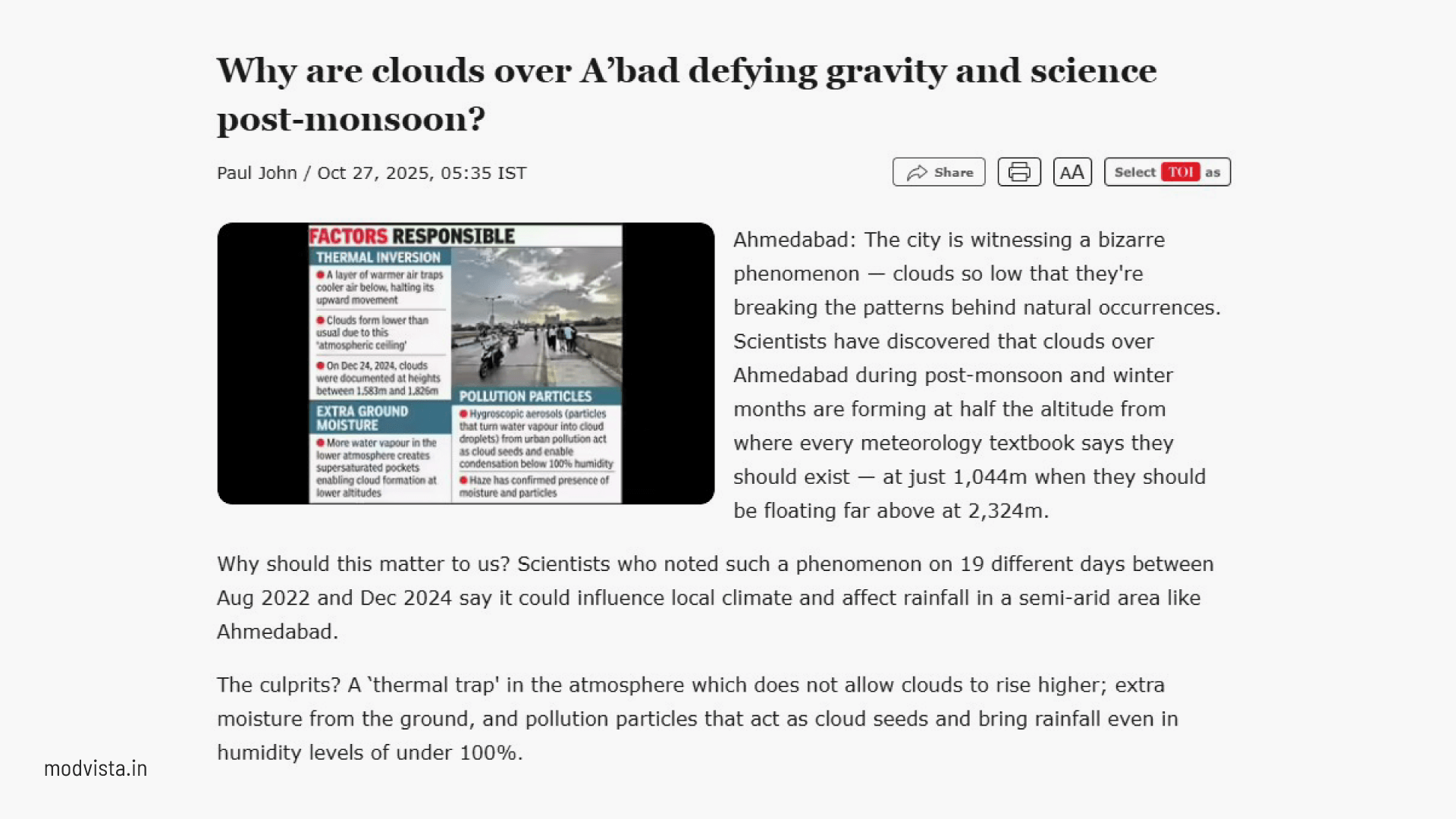Climate change is no longer just theoretical talk. Its impact is far and wide, affecting our lives in more ways than one.  As per the latest joint research by scientists of PRL, IIT Gandhinagar, Isro-Space Applications Centre, Ahmedabad, Scripps Institution of Oceanography in California and University De la Reunion in France. (source: Times of India) , Ahmedabad is facing a bizarre phenomenon. During post-monsoon and winter months, clouds over the city are forming at nearly half their usual altitude — at just 1,044 m, when they should ideally be floating above 2,324 m.